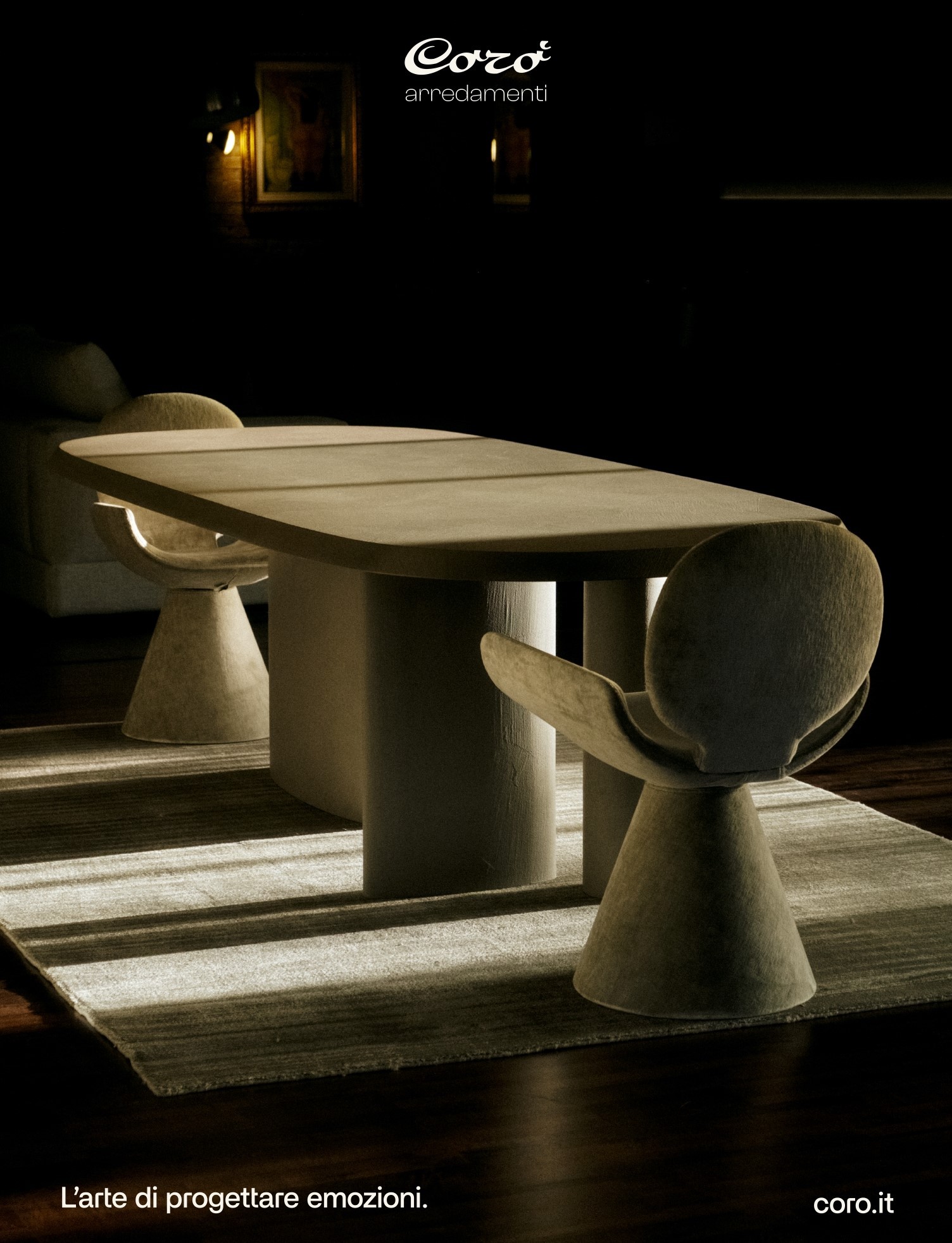Una pagina dedicata celebra la forza materica e l’armonia geometrica di questo tavolo, rendendolo protagonista di un dialogo tra design e architettura contemporanea.