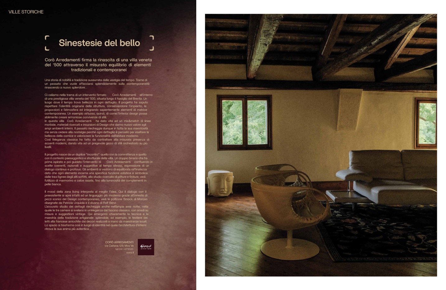 In questa villa Corò Arredamenti ha dato vita ad un mix&match di linee morbide, materiali ricercati e incursioni di Design che danno nuovo valore agli ampi ambienti interni. Il passato riecheggia dunque in tutta la sua maestosità ma senza cedere alla nostalgia perché ogni dettaglio è pensato per esaltare la bellezza della cornice e valorizzare la funzionalità dell’abitare moderno.