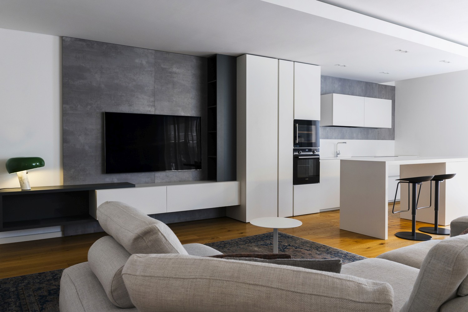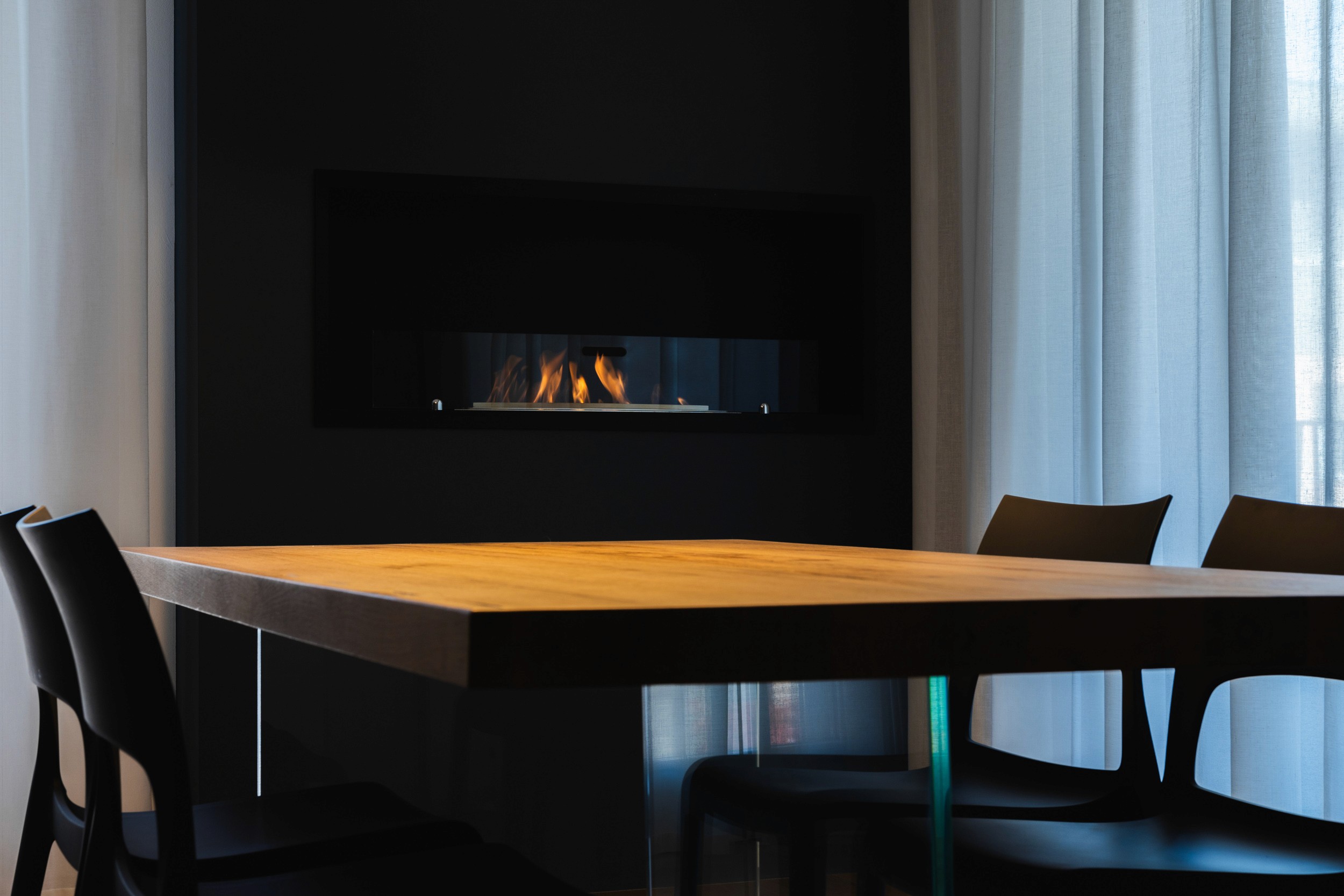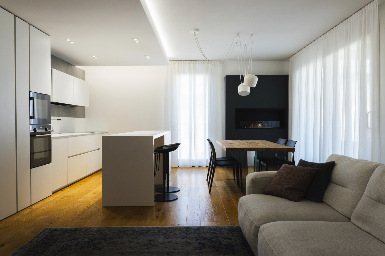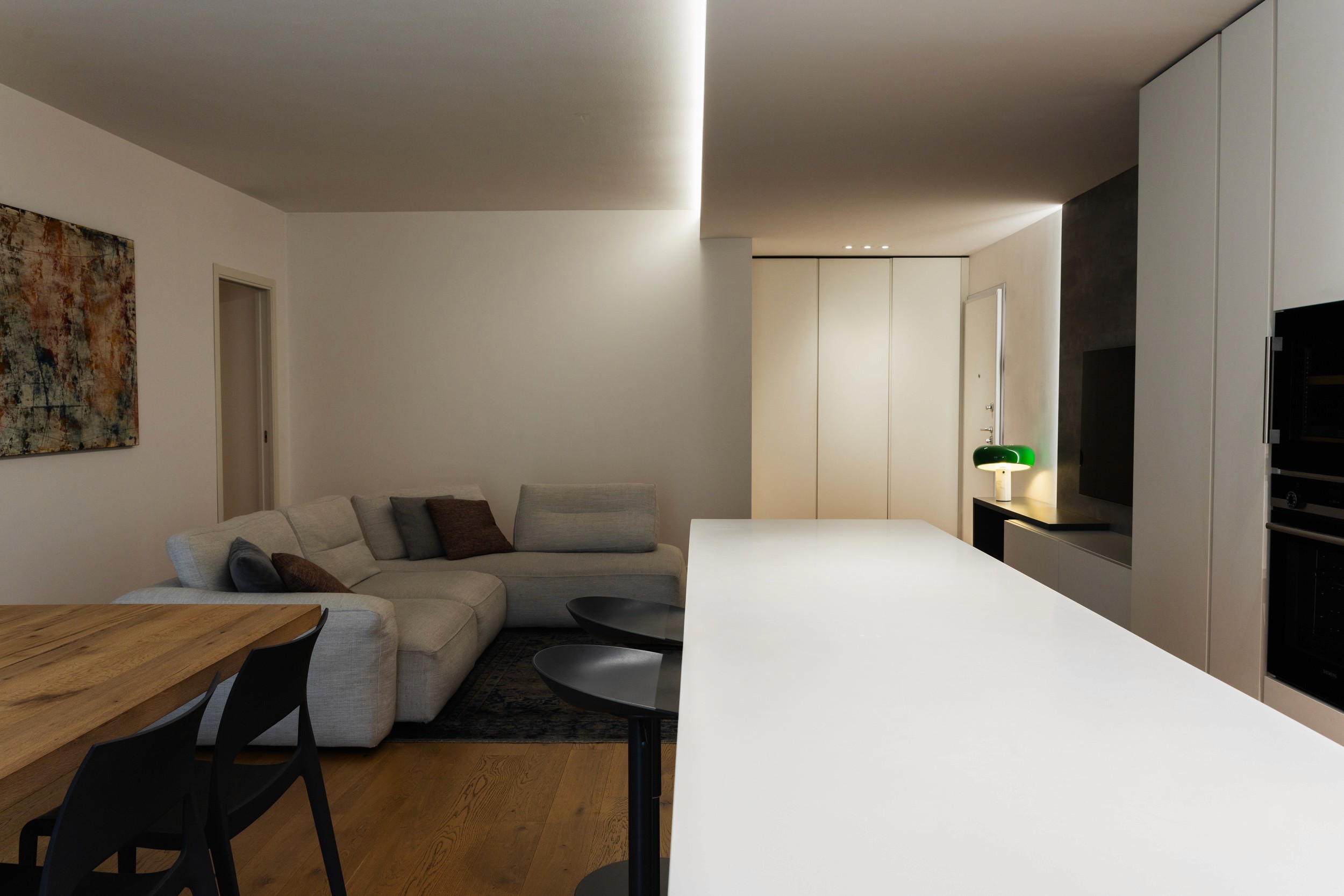 Linee pulite e materiali selezionati definiscono la cucina su misura, con piani in Corian e pareti in finitura cemento. Affacciata sul soggiorno, diventa cuore conviviale della casa. Il biocamino aggiunge calore e leggerezza visiva.