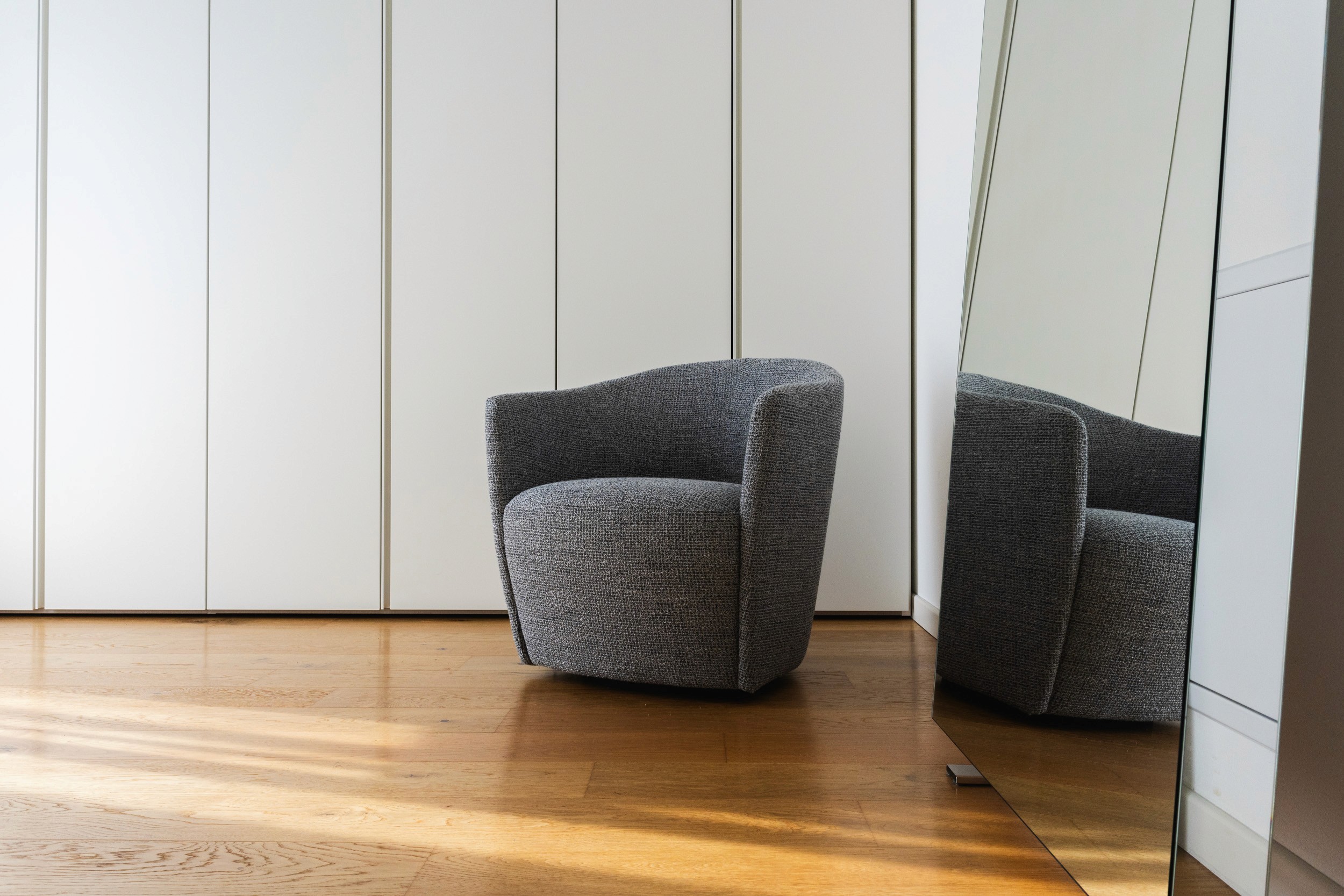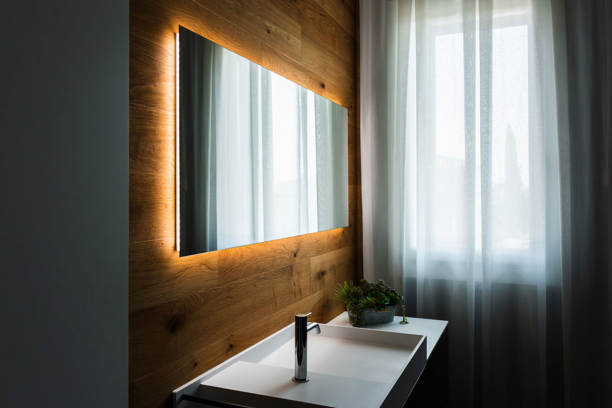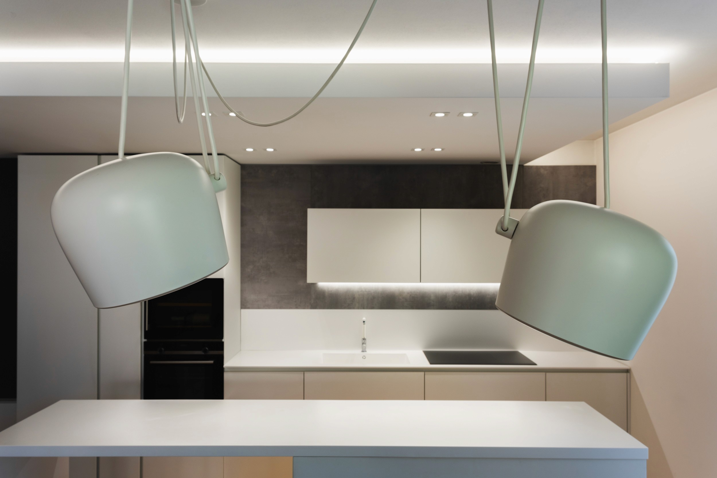 Luci integrate e giochi di ombre valorizzano materiali e proporzioni, creando atmosfera e guidando lo sguardo tra le superfici.