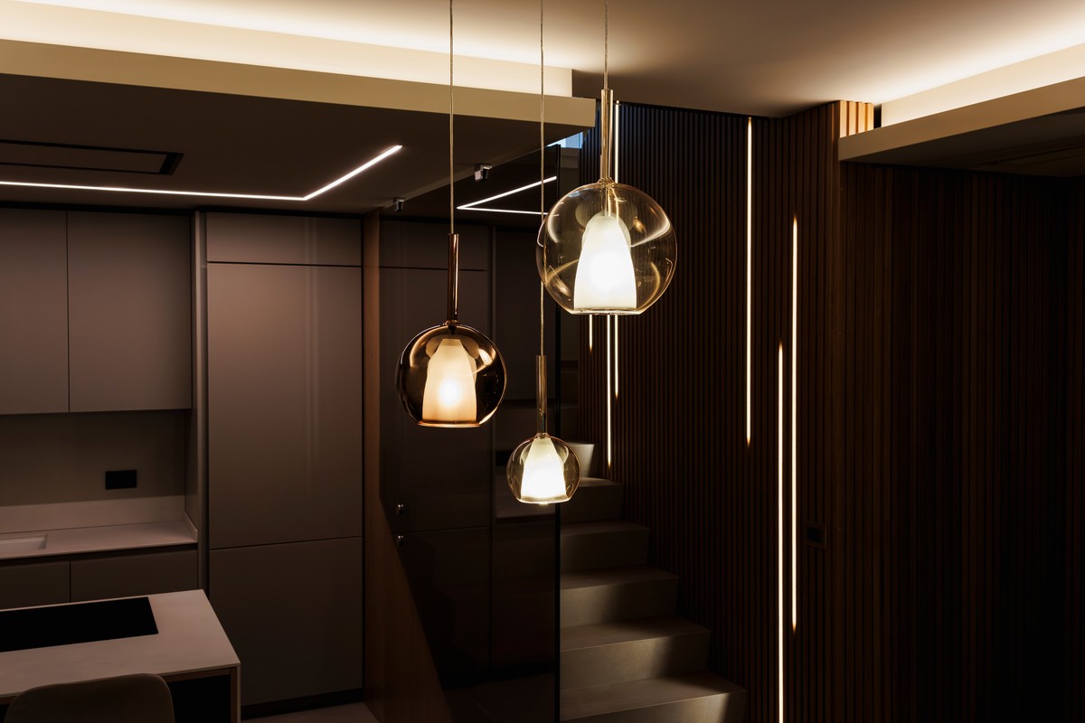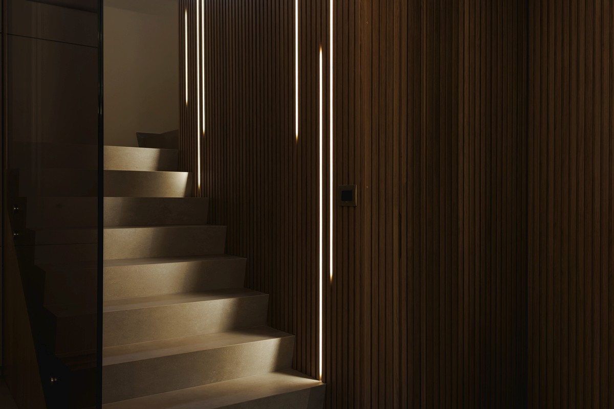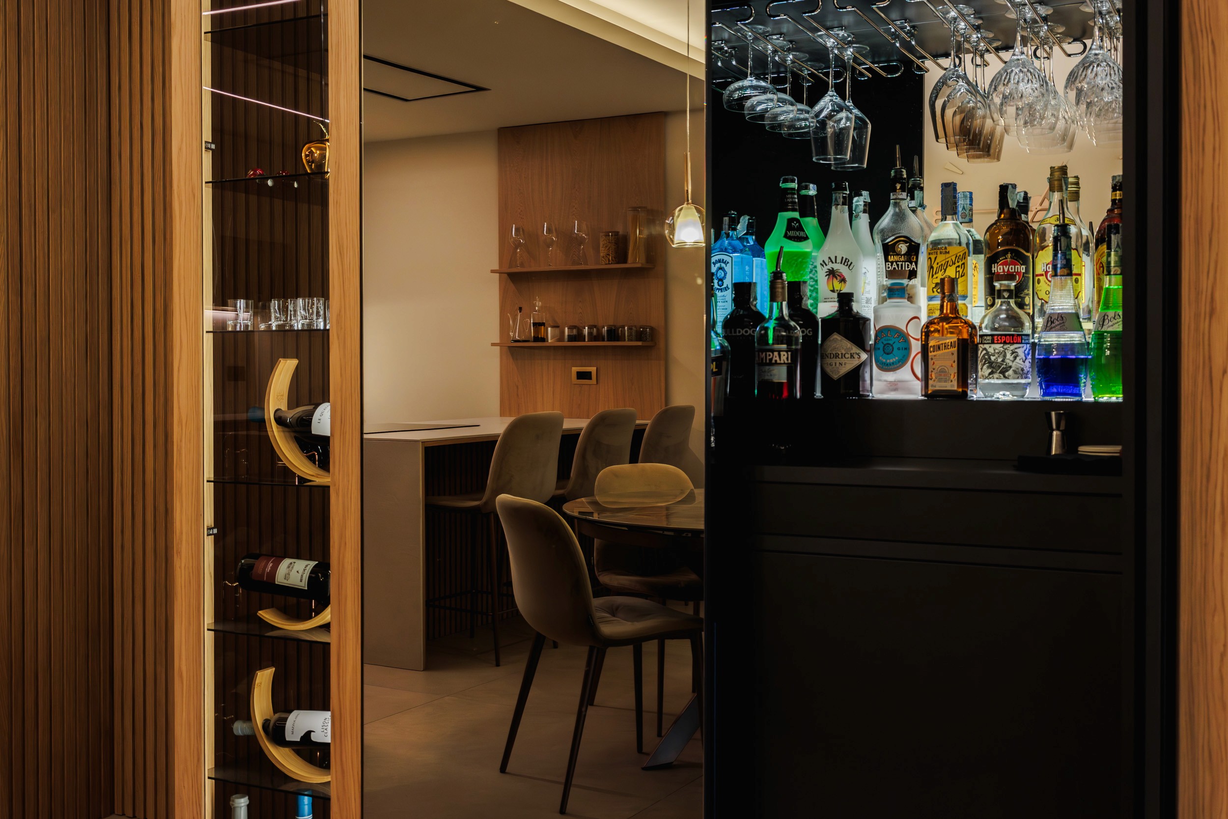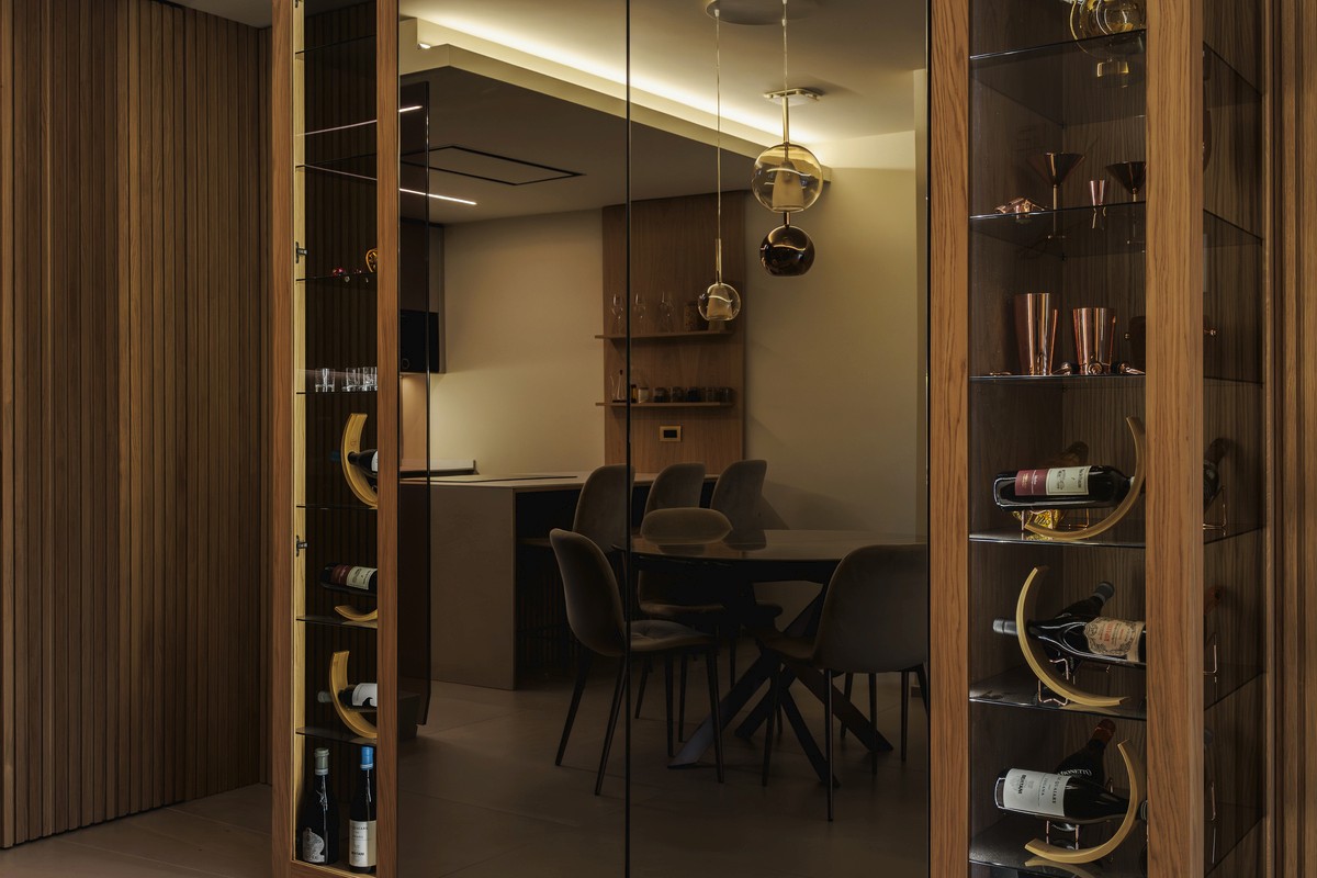 Luce e materia dialogano tra loro grazie ad uno studio illuminotecnico accurato: fasce LED tra le doghe, luci integrate nelle velette e giochi di ombre che valorizzano le superfici lignee e i materiali scelti.