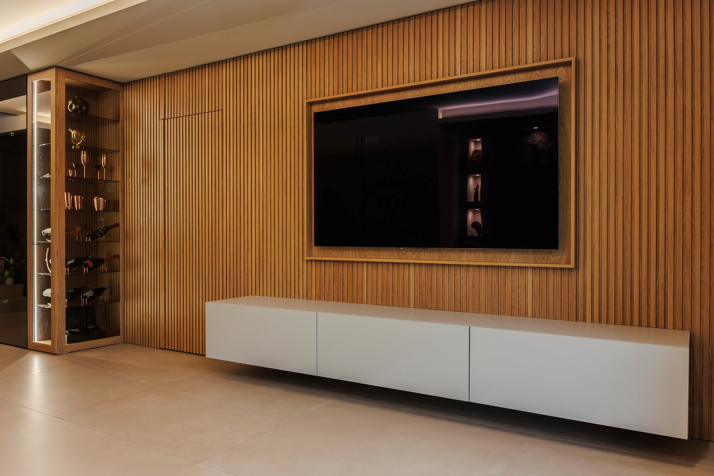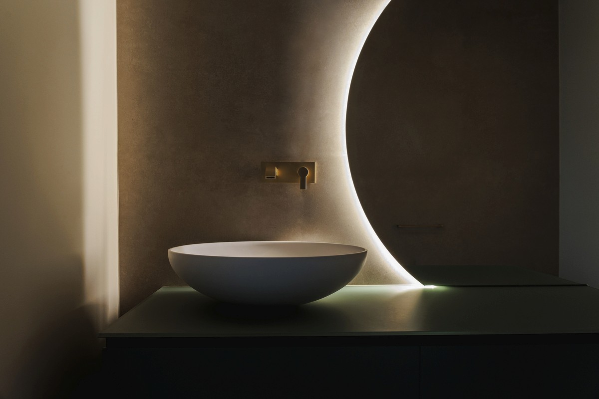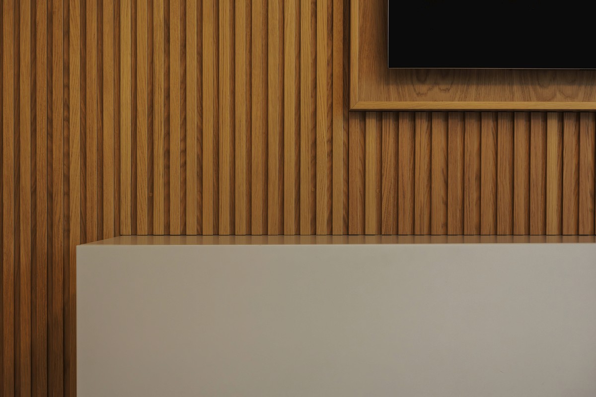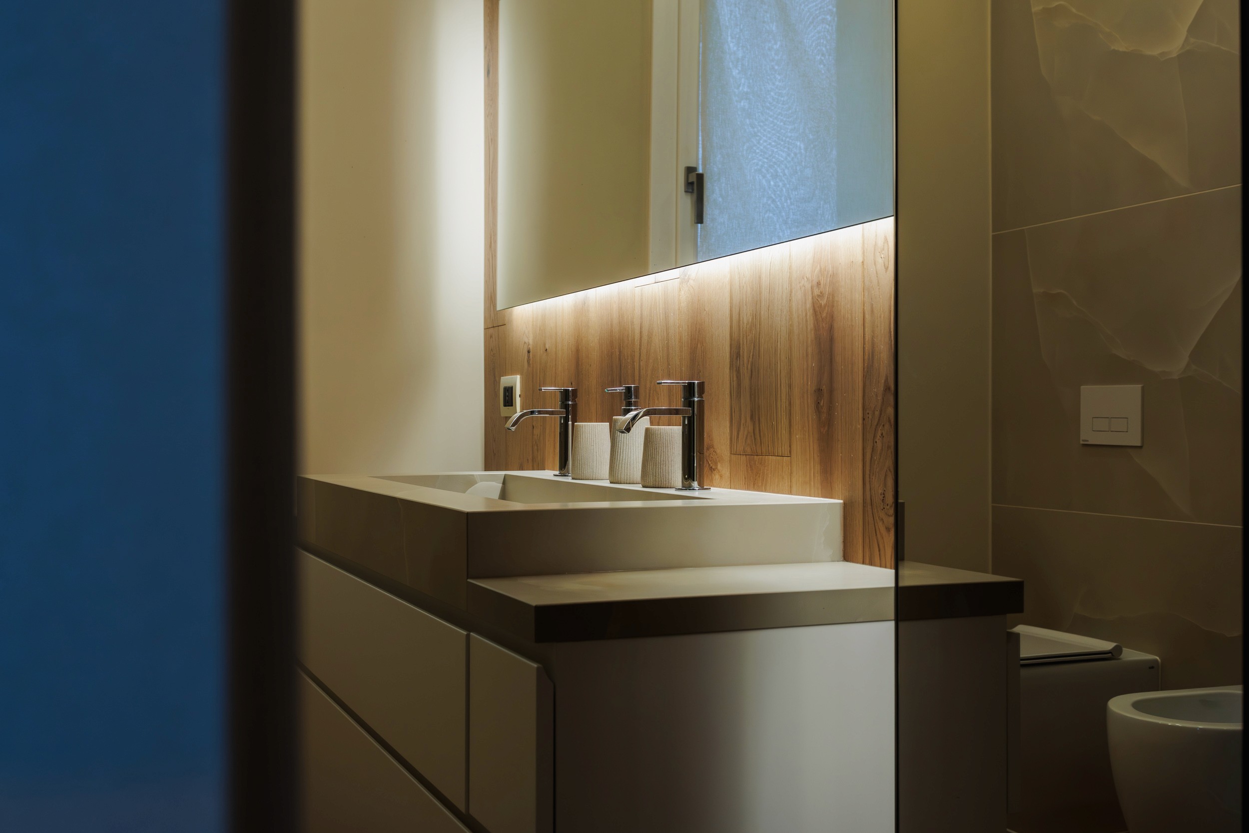 Luce e materia dialogano tra loro grazie ad uno studio illuminotecnico accurato: fasce LED tra le doghe, luci integrate nelle velette e giochi di ombre che valorizzano le superfici lignee e i materiali scelti.