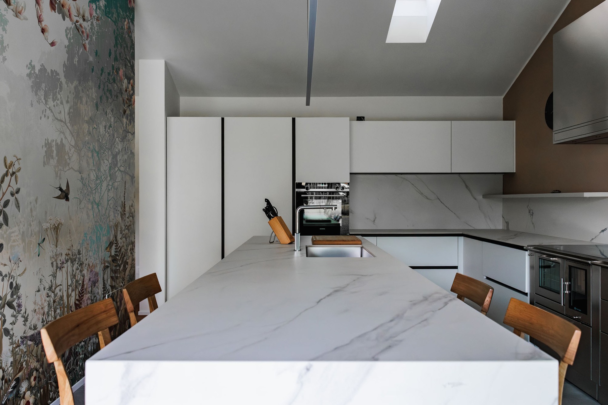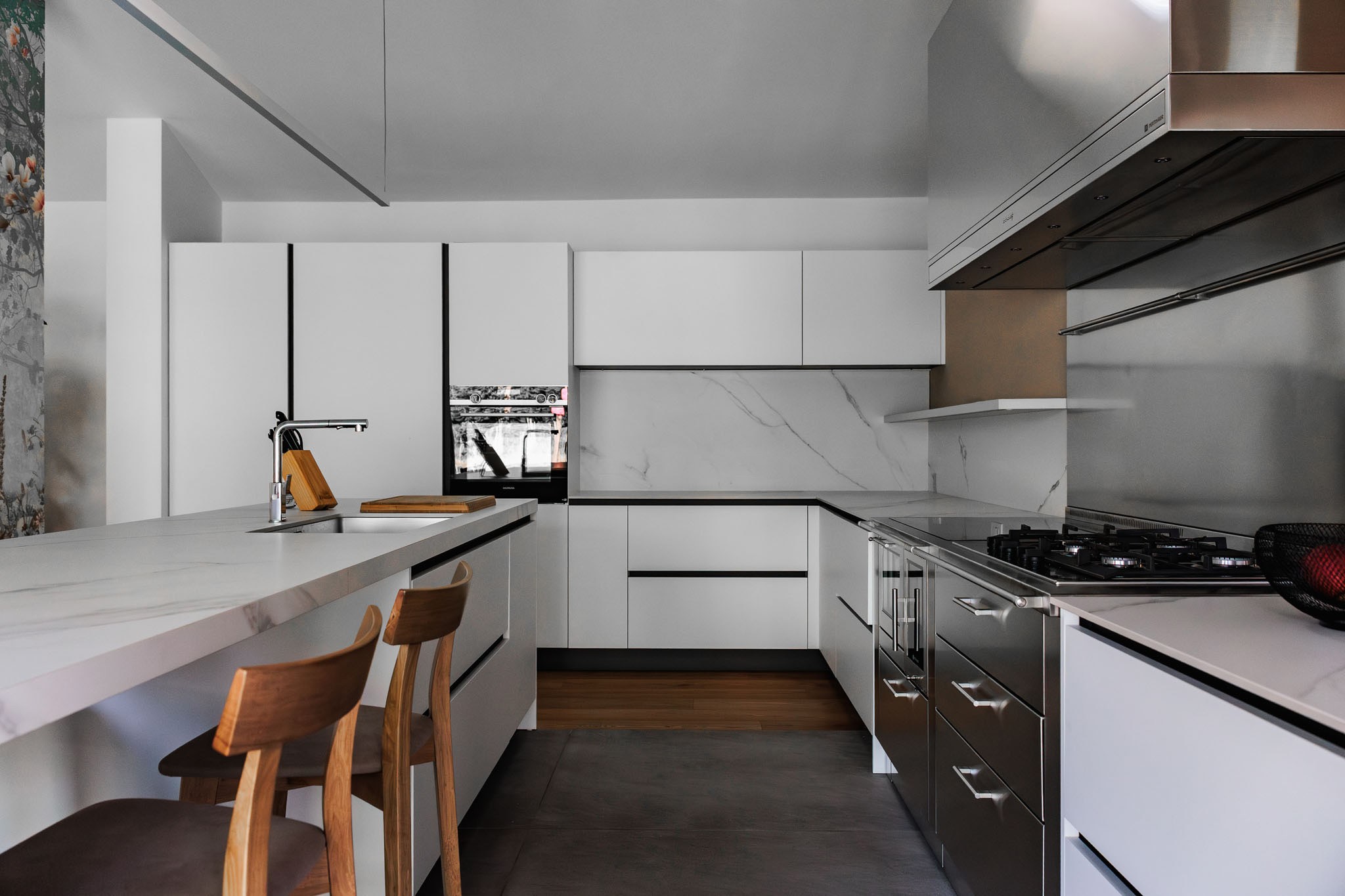 Acciaio inox, ceramica e legni laccati opachi dialogano tra loro, ridisegnando lo spazio con equilibrio e carattere. Ogni anta, ogni piano, ogni dettaglio è calibrato per creare armonia visiva e praticità quotidiana.