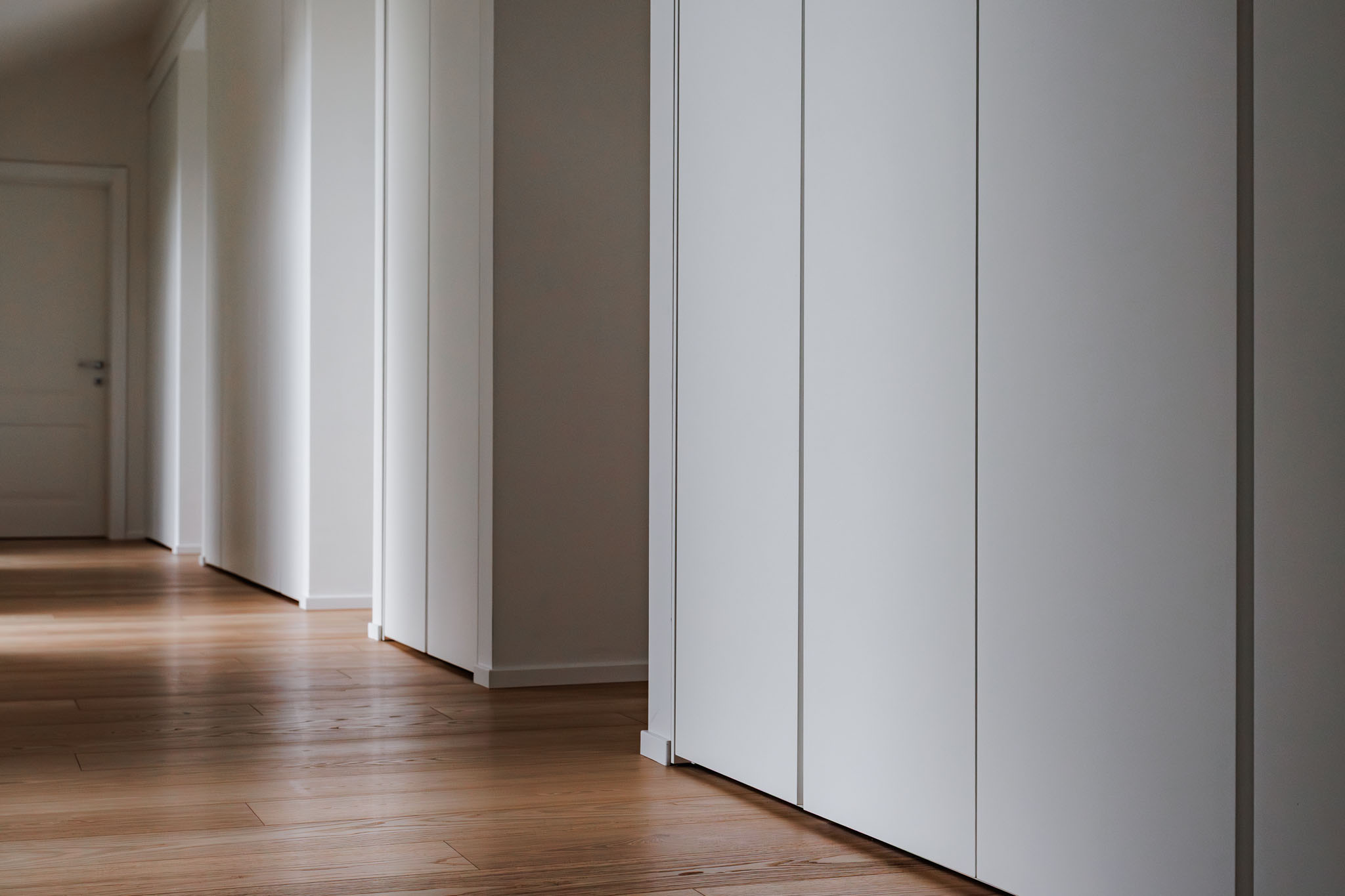 Armadiature integrate in nicchia, laccate tono su tono con le pareti, si fondono con l’architettura: il risultato è uno spazio ordinato, elegante, leggero, dove nulla interrompe la vista e tutto è al suo posto.