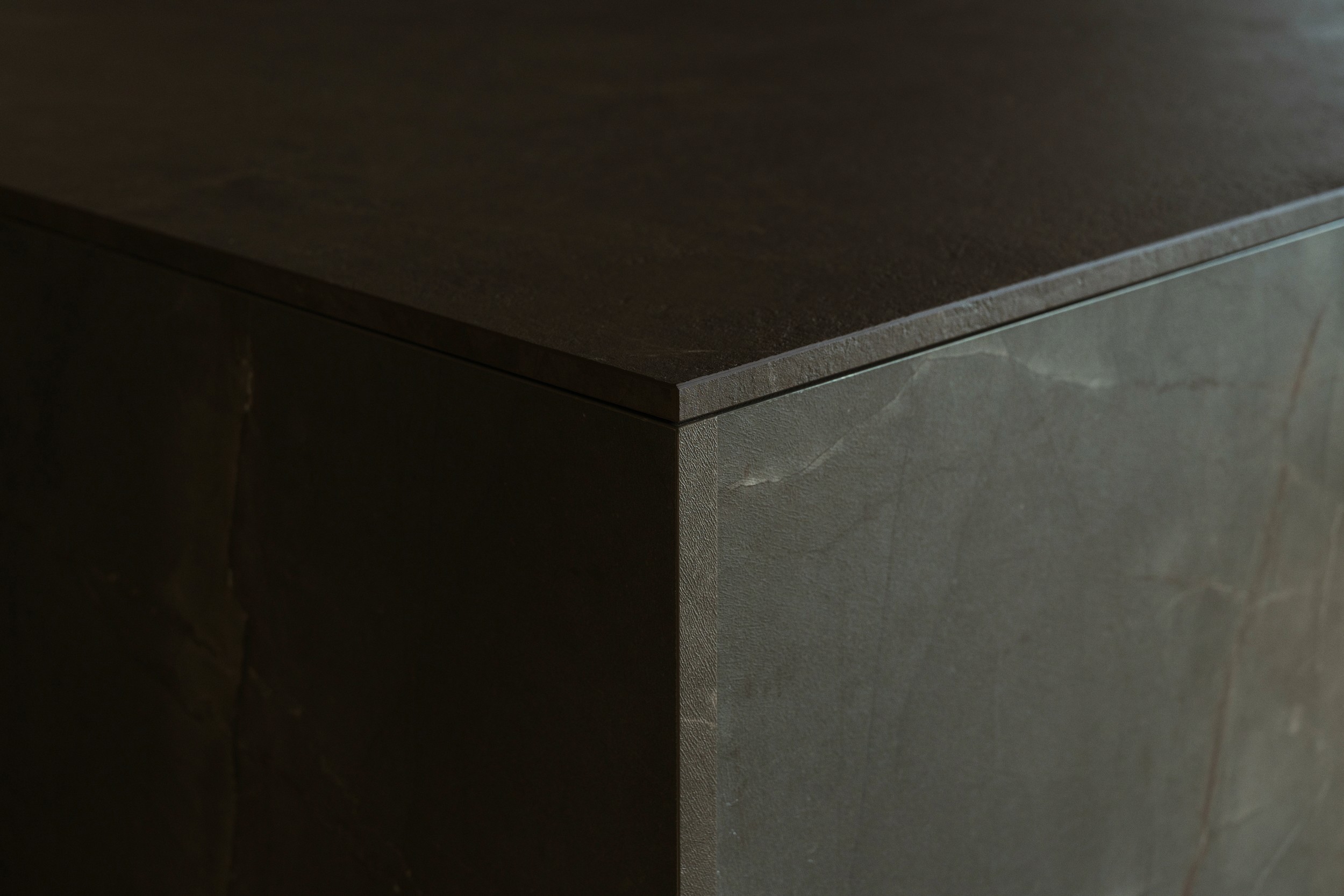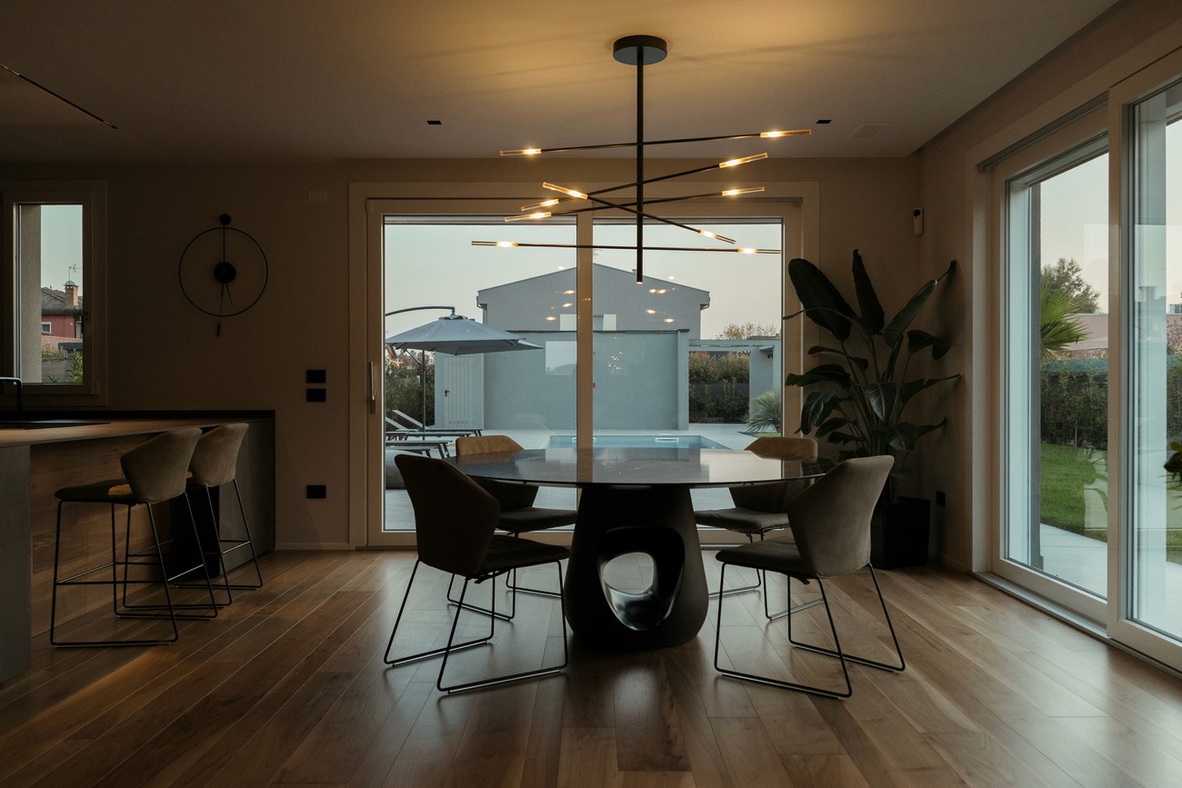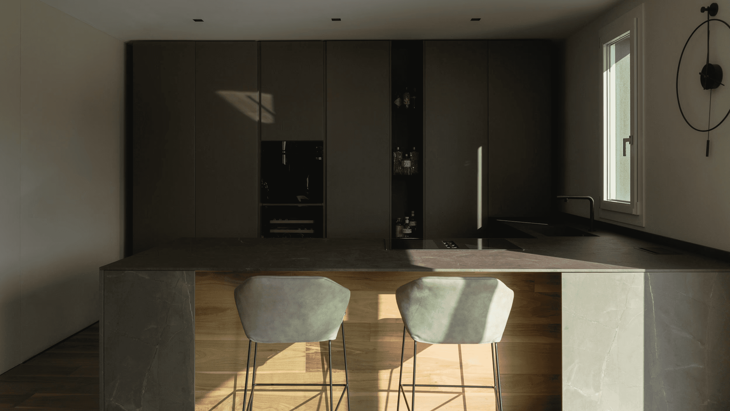 I legni laccati metallizzati caratterizzano la cucina, mentre il piano e la base sospesa della TV, entrambi in ceramica, introducono un elemento di matericità e resistenza. Ogni superficie e finitura è pensata per armonizzare estetica e funzionalità, amplificando la sensazione di movimento e profondità.