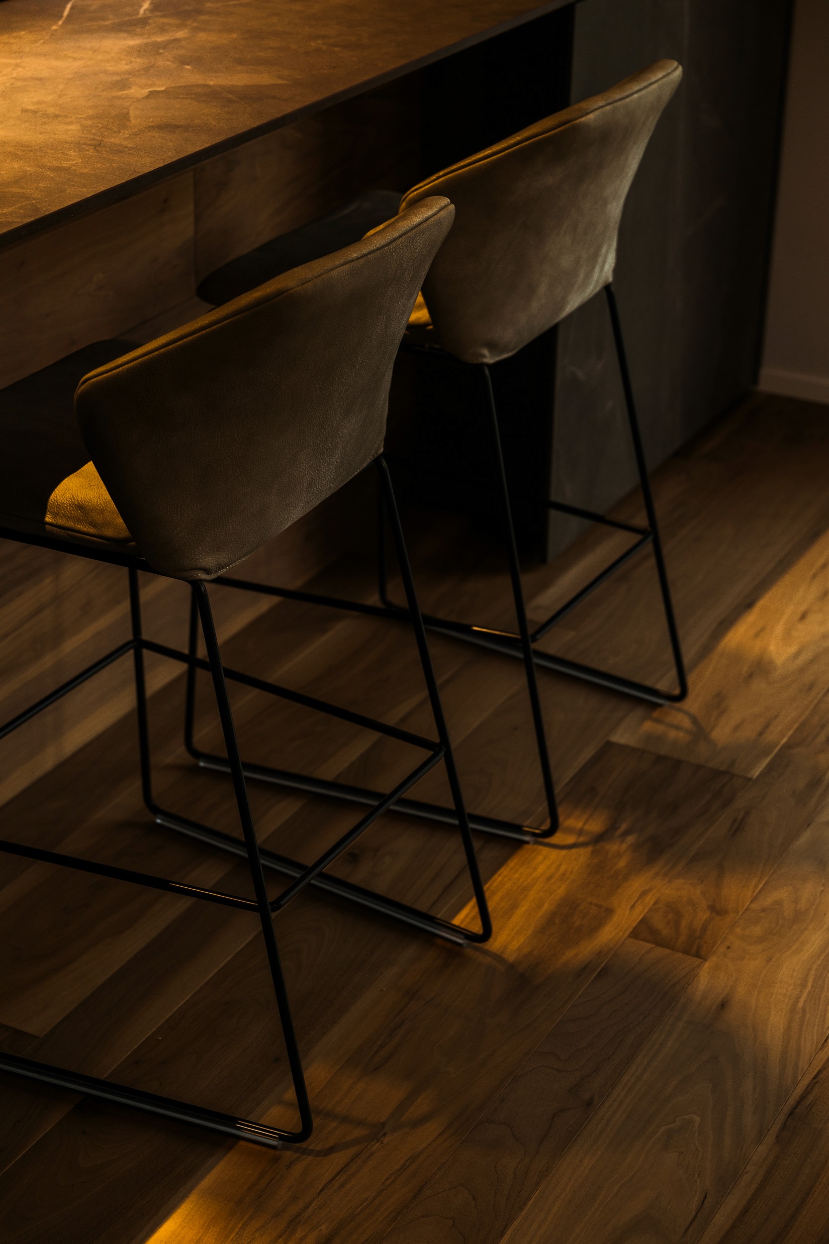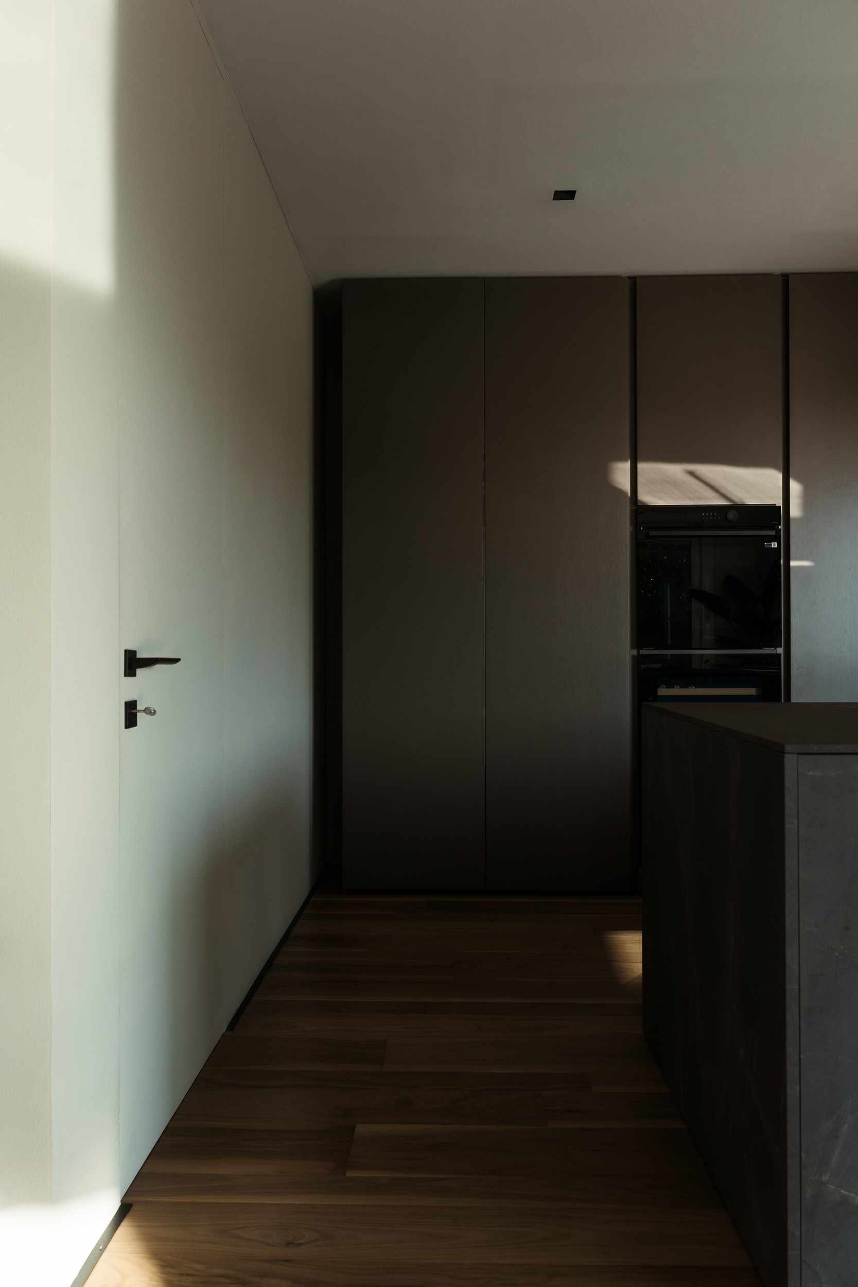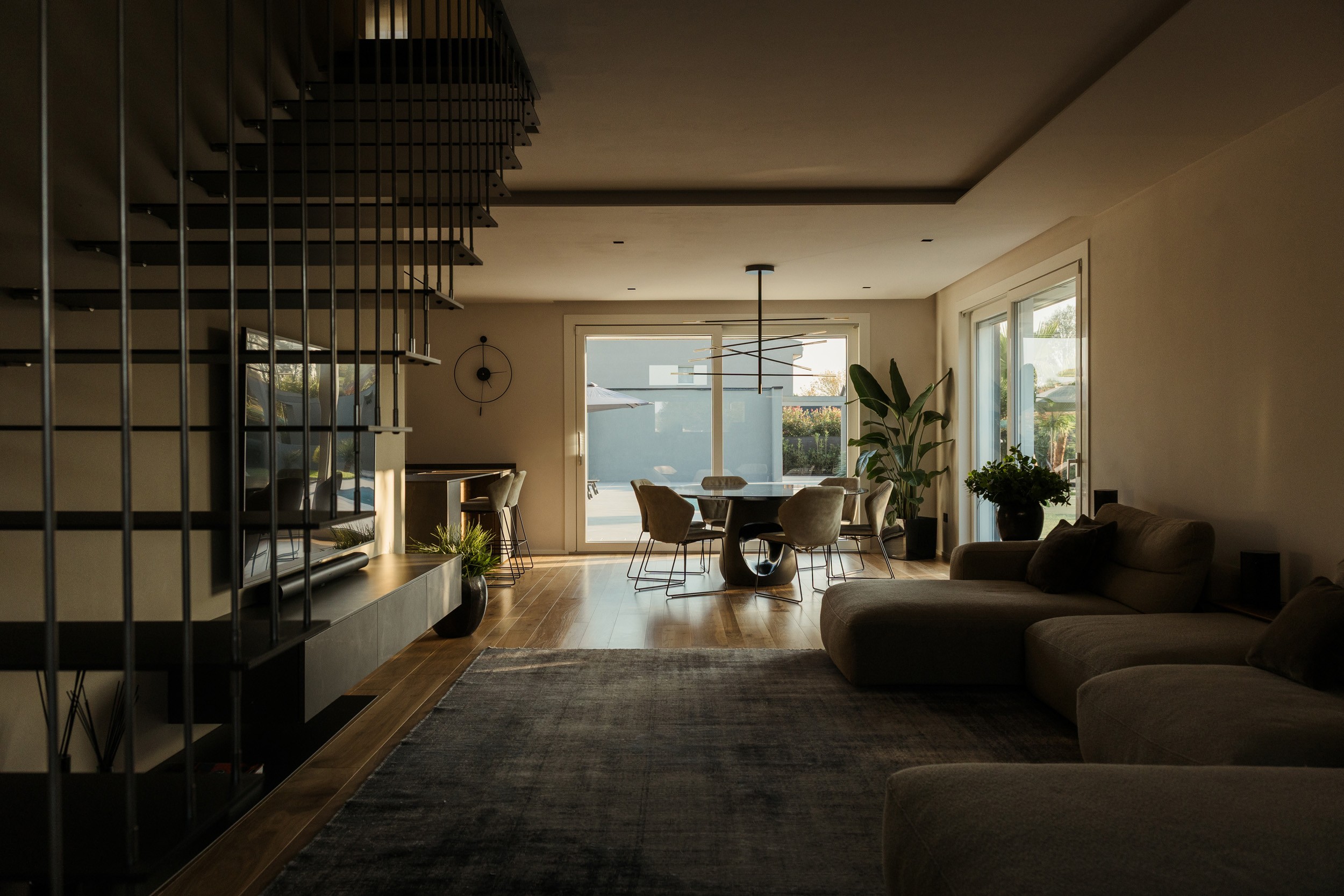 I legni laccati metallizzati caratterizzano la cucina, mentre il piano e la base sospesa della TV, entrambi in ceramica, introducono un elemento di matericità e resistenza. Ogni superficie e finitura è pensata per armonizzare estetica e funzionalità, amplificando la sensazione di movimento e profondità.