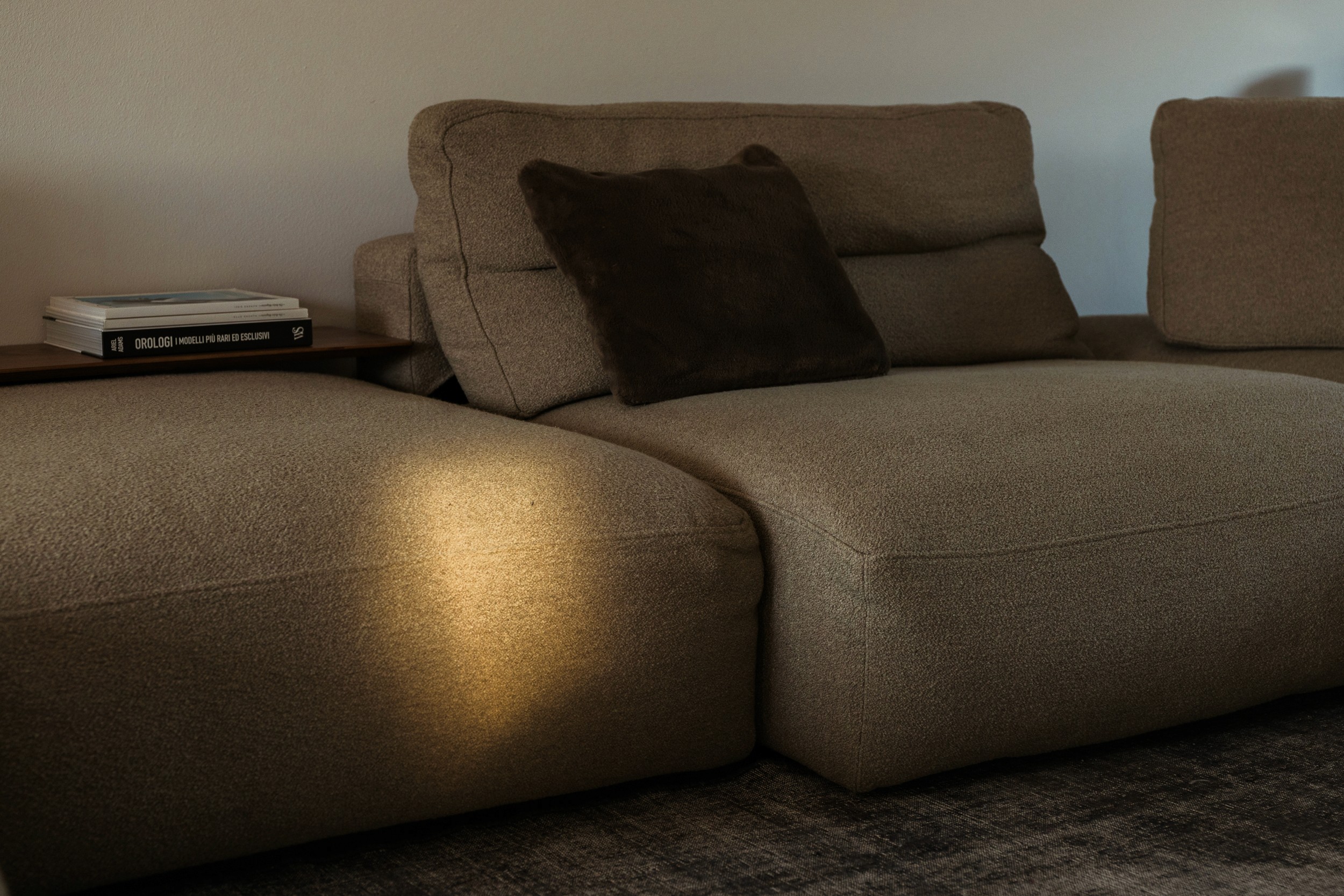 Il divano con pouf scorrevoli unisce memoria, comfort e design. Tavoli d’appoggio funzionali e cuscini cilindrici completano la composizione, mentre le forme arrotondate e gli spigoli smussati aggiungono leggerezza e poesia agli spazi.