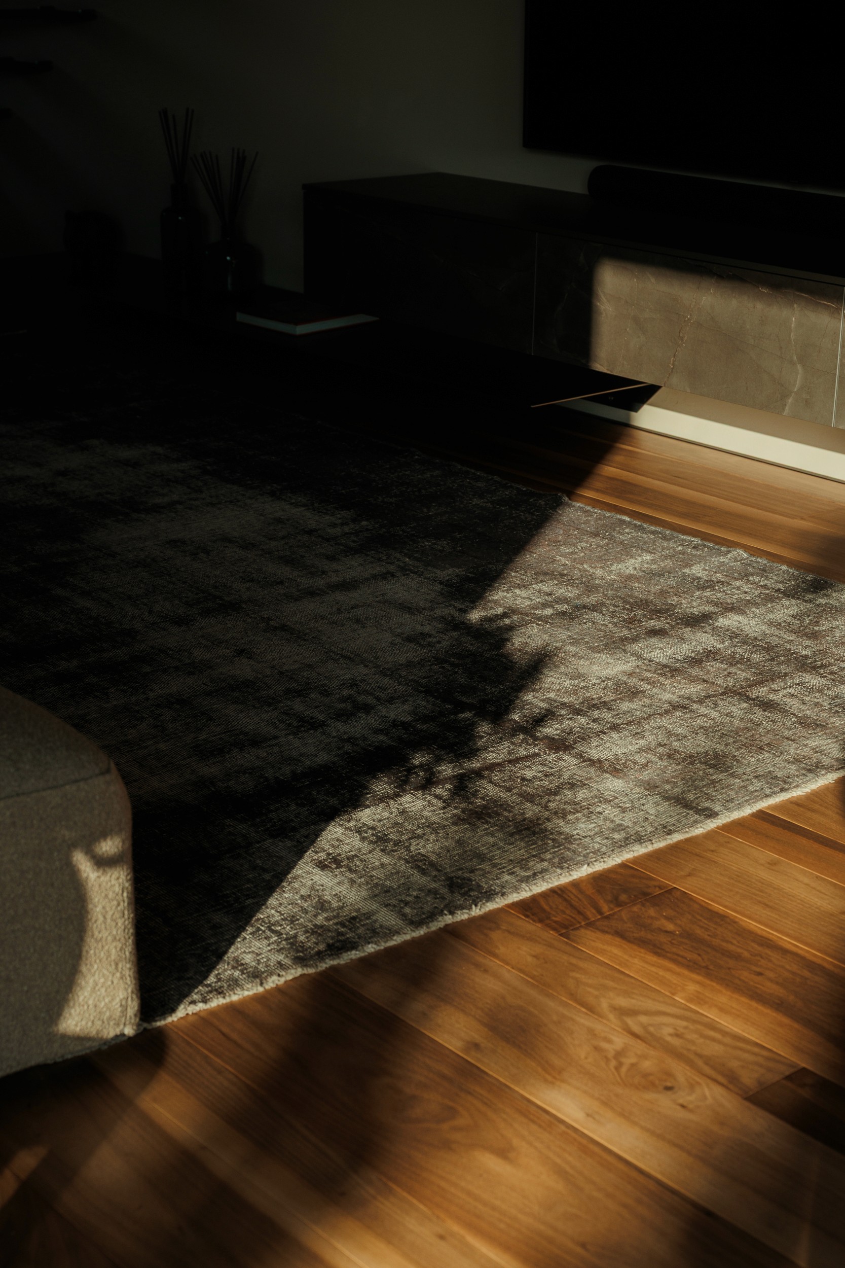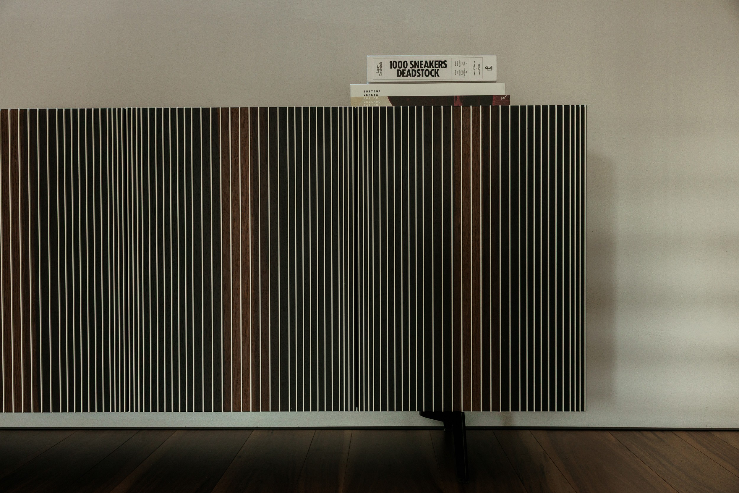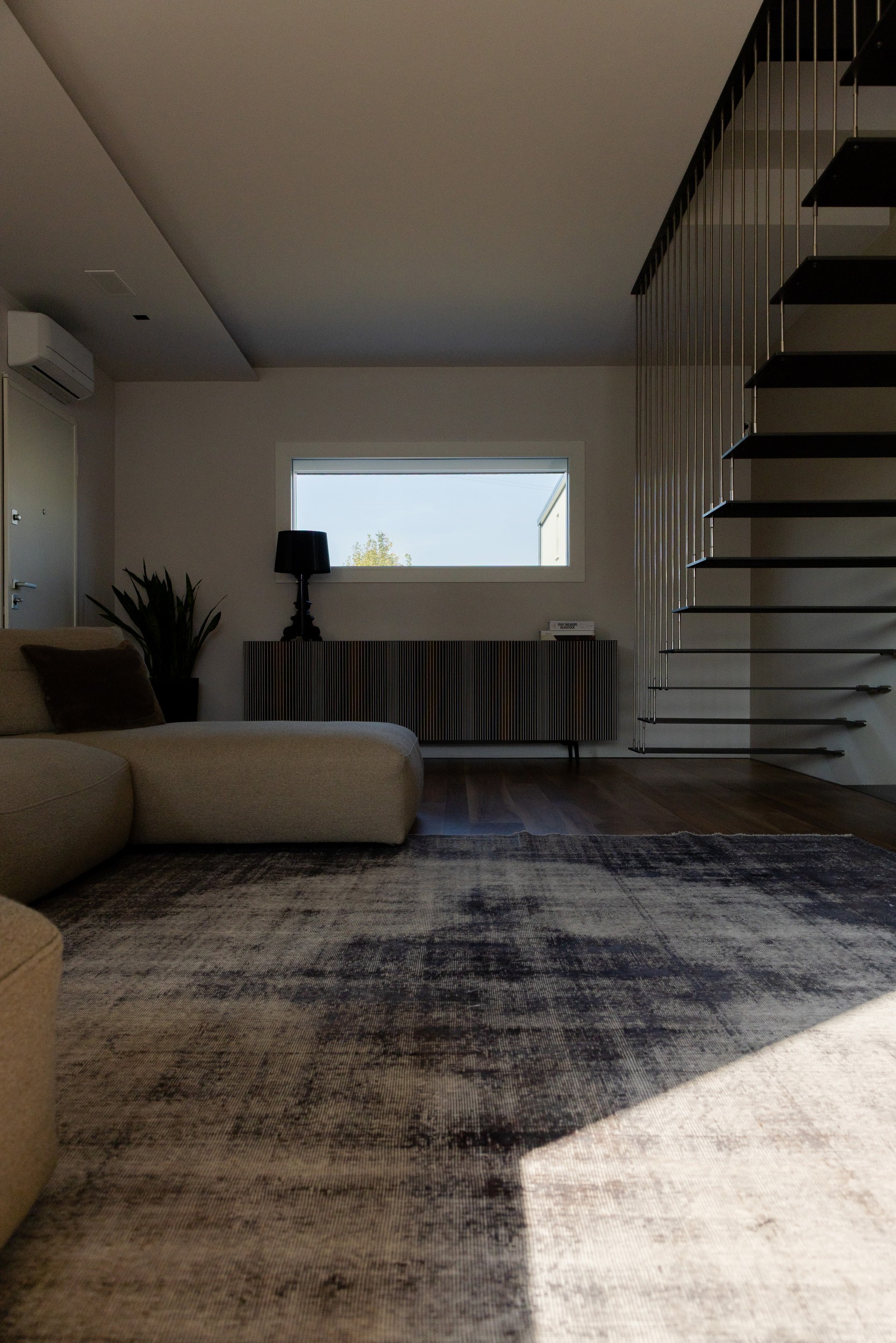 La madia diventa protagonista: chi guarda non è spettatore, ma attore che interagisce con il mobile, percependone i colori che mutano al variare del punto di vista. Un effetto simile a un sipario che si apre e si chiude, in un dialogo continuo con la scala sospesa in acciaio e supporti a muro.
