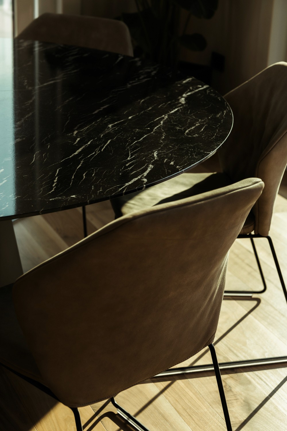 Il tavolo rotondo in marmo Marquinia con basamento centrale in cemento fonde materiali preziosi e proporzioni generose. Ogni dettaglio nasce da uno studio incessante della relazione tra uomo, ambiente e materiali, trasformando il tavolo in un elemento contemporaneo, lussuoso e di forte personalità.